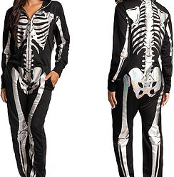 Shimmering women’s skeleton jumpsuit with full-body bone print, hood with mesh eye holes, and front zipper closure. Made from durable, comfy polyester with convenient zippered pockets. Perfect for a sleek, spooky Halloween look.
